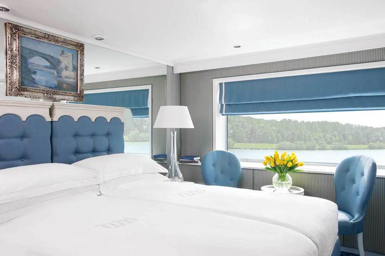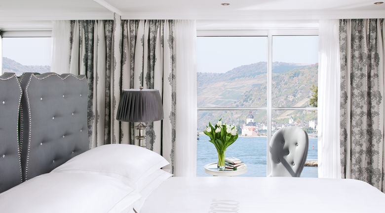 Lavishly appointed riverview stateroom (151 sq ft - 14 sq m) with a French balconyHandcrafted Savoir® Beds of England, built-in closet, hair dryer, safe, individual thermostat, flat-screen TV with infotainment center and satelliteMarble bathroom with Asprey bath and body products, plush towels, heated mirror, backlit magnifying mirror, comfortable bathrobes and slippers