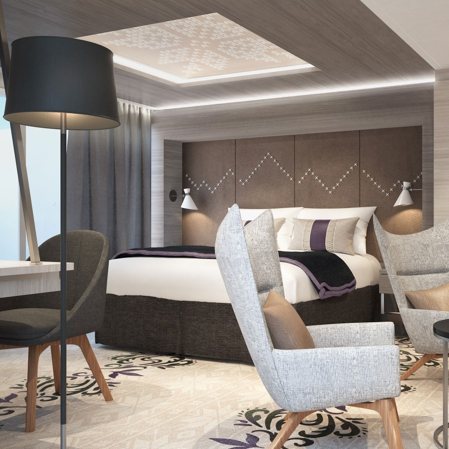 Large Corner Suite with private balcony, flexible sleeping arrangements, sofabed, TV, minibar, bathrobe, kettle, espresso maker. Adapted for guests with wheelchair.Please note: This cabin is automatically made with a double bed. To order twin beds, please notify us at time of booking.