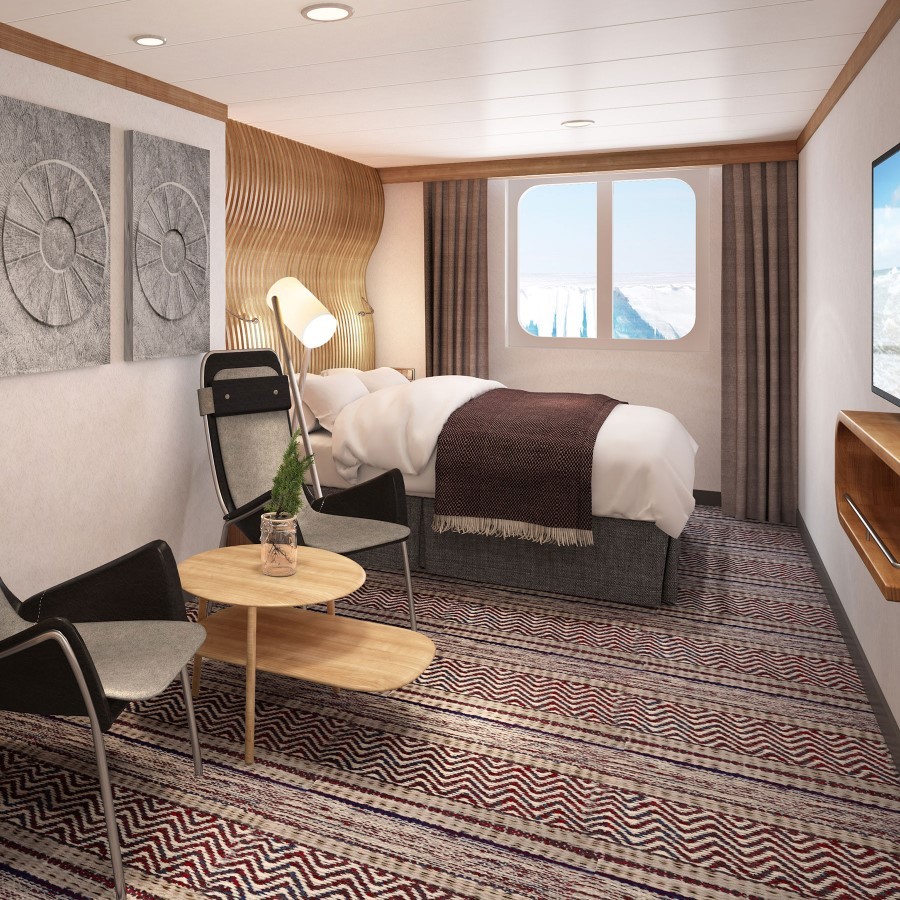Corner cabin with large windows. Flexible sleeping arrangements, TV, minibar, bathrobe, kettle, tea and coffee, espresso maker. Without balcony.Please note: This cabin is automatically made with a double bed. To order twin beds, please notify us at time of booking.