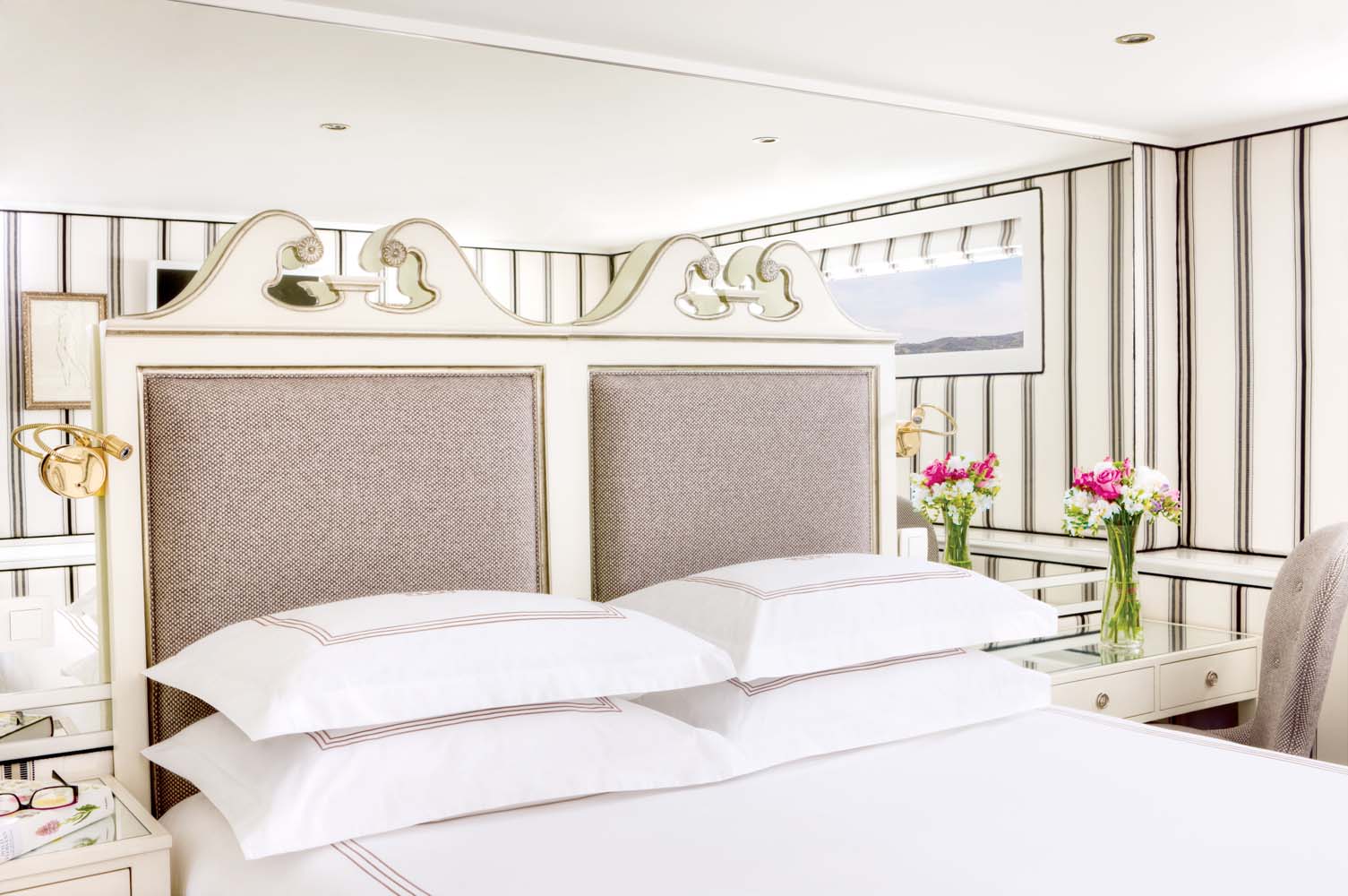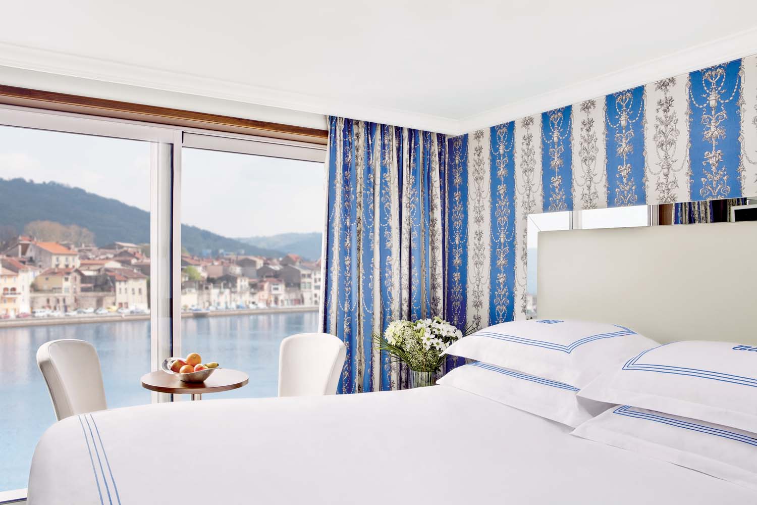 Lavishly appointed riverview suite with French Balcony Handcrafted Savoir of England beds draped in fine linens with choice of pillows, built-in closets, hair dryer, safe, individual thermostat, flat-screen TV wit infotainment center and satellite, and bottled water Bathroom features L'Occitane en Provence bath and body products, plush towels, cozy bathrobes and slippers Many more additional special amenities and services.